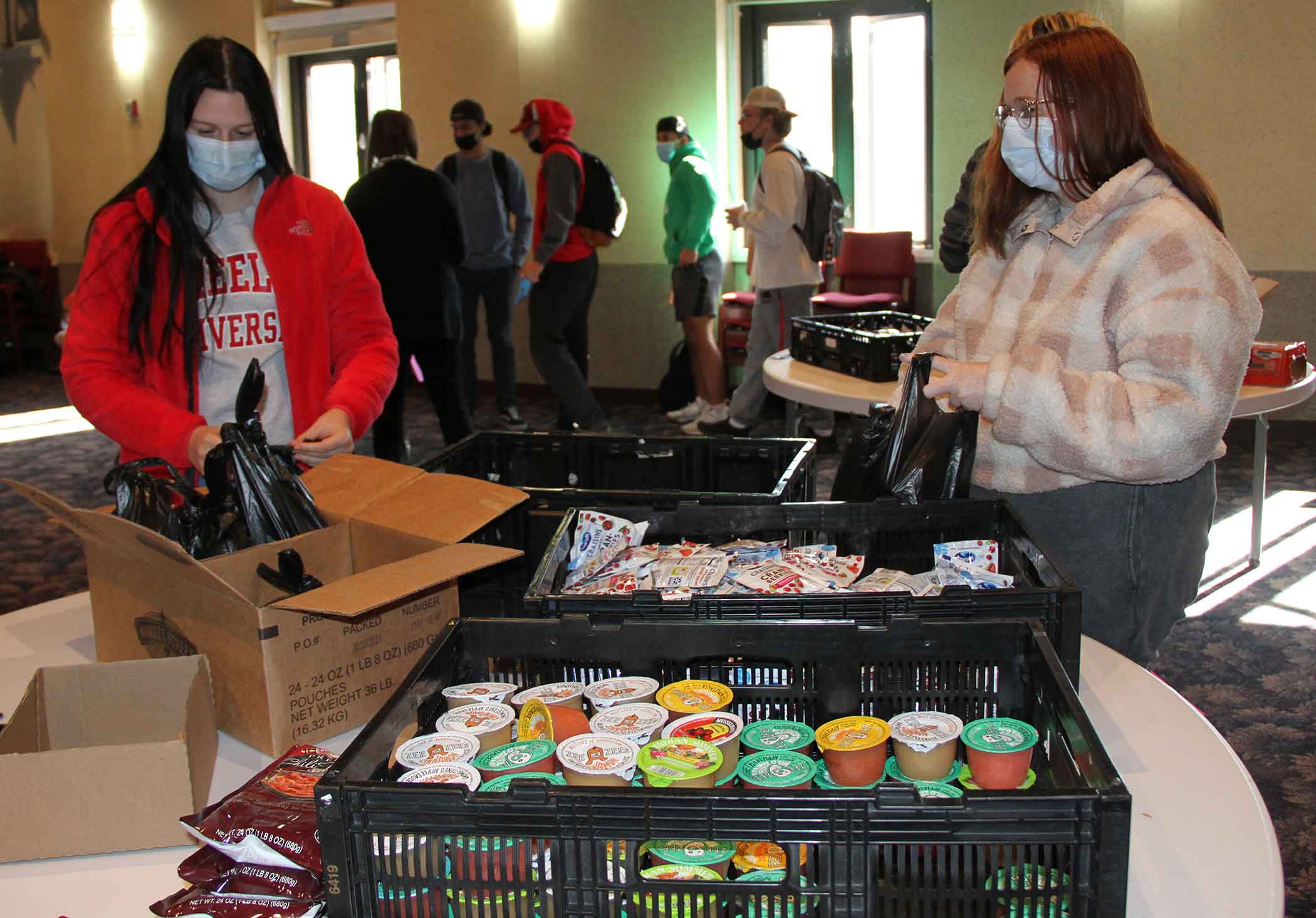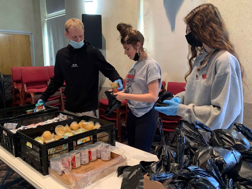 Twenty tables were set up inside the University’s Troy Theater and students wore masks and gloves and were spaced out to adhere to COVID-19 safety protocols. At each table, students trained each other, gathered and placed a can of soup, a fruit cup, applesauce, ramen and dried fruit into bag. Once all of the meal bags were finished, the Wheeling students helped Whitelatch load all of the meals into a van, which were taken back to Catholic Charities where they will be distributed to their clients.
